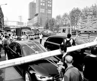 昨日上午,武汉市解放大道循礼门大润发超市门前,一辆行进中的3路电车“辫子”突然脱线,将一根路灯杆拉断,折断的路灯杆砸中路边准备扎花的两辆奥迪婚车,幸无人员伤亡。警方表示,此次事故系电车司机不按安全规范操作造成。(楚天都市报)