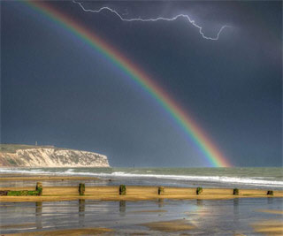 英国自然风光摄影师杰明-拉塞尔12日在英国怀特岛卡尔弗海滩上捕捉到了一幅闪电和彩虹同时出现在天空的奇特自然景观,美轮美奂,让人惊叹。(中新网)