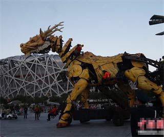 15日,法国机械“龙马”在北京鸟巢外试运行。中法建交50周年纪念项目-法国机械“龙马”巡游表演将于17日至19日举行。(中新网)