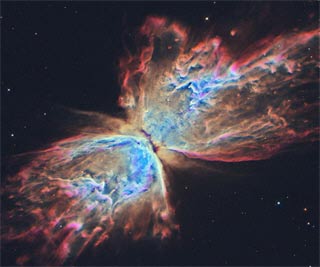 近日,哈勃太空望远镜拍摄到恒星“死亡”的画面,其颜色十分绚丽,形状酷似一只蝴蝶。这一星云距离银河系大约有3800光年,是类太阳恒星演化晚期的产物。(人民网)