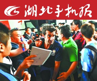 昨日,由萨内蒂、菲戈、德约卡夫、托尔多等传奇球星领衔的国际米兰传奇明星队造访武汉,作客中意足球传奇明星对抗赛新闻发布会。这支传奇明星队曾携手为国际米兰摘下意甲、欧冠等荣耀,他们将于19日晚在武汉沌口体育中心对阵蔡晟、范志毅、高雷雷以及林强、刘伟等球员组成的湖北老甲A队。图为菲戈亮相与球迷打招呼。(中新网)