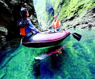 近日,游客乘皮筏在距恩施鹤峰县城6公里远的屏山峡谷地缝游览,河水清澈见底,船行上面犹如漂浮在空中。(湖北日报)