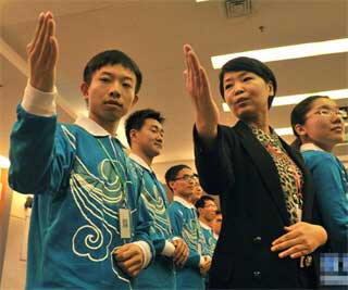 21日,2014年APEC领导人会议周志愿者培训在北京开班。来自北大、清华等23所高校的2280名志愿者将在8天时间里系统学习APEC知识、国际会议英语、礼仪形象塑造等内容。(新华网)