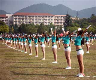 近年来,浙江农林大学重视学生的体能素质锻炼,广播体操再现校园。23日,该校学生穿热裤露脐装做广播体操。(人民网)