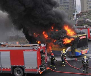 今日,重庆公交集团在江北大石坝公交站场组织展开综合应急演练,其中为了模拟真实的着火场景,一辆公交车被点燃。(中新网)