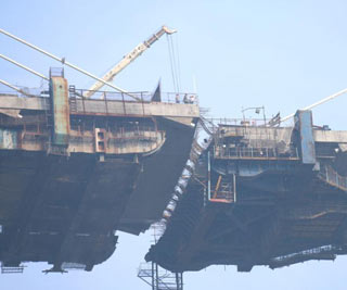 昨日下午,湖南省郴州市宜章县境内在建的厦蓉高速(厦门至成都)赤石大桥一正在施工的索塔内部起火,导致9根拉绳被烧断。断裂的桥面一侧至少下沉两米,火灾原因正在调查。(中新网)