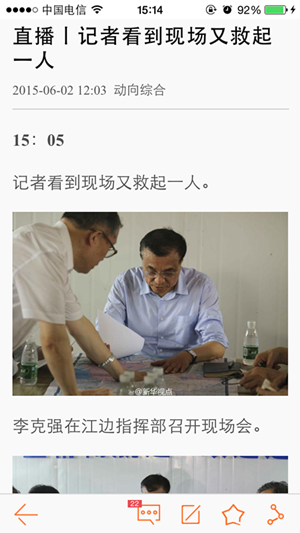 6月2日凌晨,载有458人的客船“东方之星”在长江监利段遭遇大风发生翻沉。凌晨4时10分,动向接到消息后,编辑立即做出反应,第一时间搜集信息弹出新闻。早晨6时,动向第一批编辑已全部到岗,在值班总编辑领导下,开展全方位的图文直播和聚焦报道。