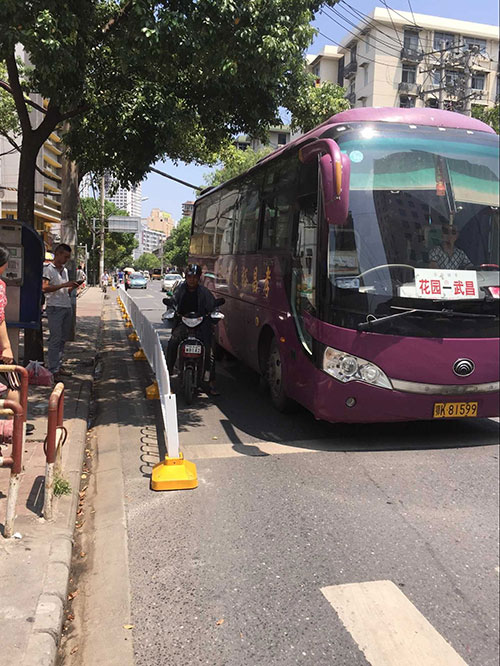 湖北手机报消息(记者文生)武昌梅苑路被付家坡长途客运站、武昌宏基客运站、武昌火车站三大站夹在中间,梅苑路与紫阳东路交汇路口更是地铁四号线的梅苑路出口,人多大客车多,道路经常拥堵。可就是这样一条经常堵车的路上前天突然竖起了一排漂亮的栏杆(如图),占据了原本就不宽的两车道将近一米宽的路面。武昌区中南街办事处工会曾主席说:付家坡车站每天开往全国各地的上百辆大客车都要从这条路上经过,车道变窄后一条车道根本走不了大车,右拐的大辆会把旁边那条往左拐的车辆的道路也占住,让本来就堵的道路变得更堵。这被栏杆隔出来的近一米宽的路既走不了人,也走不了自行车,完全被浪费掉了。武昌交通大队把这排栏杆就竖在中南街办事处门口,也没有征求基层政府的意见,不是排堵而是添堵。