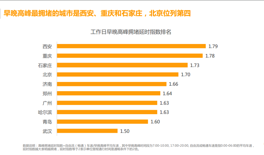 在工作日早晚高峰拥堵延时指数排名中,武汉1.50的指数排在全国城市第10,远在西安、重庆、石家庄、济南、郑州之后。其中,北京拥堵指数为1.70,广州为1.63。