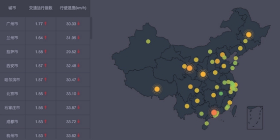 “滴滴交通信息平台”上的交通运行指数,相当于各地城市交通的“健康指标”。各地交通管理部门可以查看到,当地实时或者任意周期的平均行驶速度、全国排名等信息,还可以查看到区县、商圈、重点道路的交通运行详细情况,以做进一步的交通健康度检测分析。