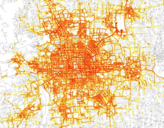 (图示:滴滴交通信息平台的出行轨迹热力图)