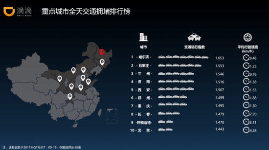 滴滴交通运行报告显示,2017年第一季度,全天拥堵排行榜上,哈尔滨、石家庄、兰州、济南、西安分别排在前五位,北京排在第十位。通过分析早晚高峰期的数据还可以看出,全国重点城市的晚高峰拥堵状态普遍比早高峰更严重相比早高峰,济南、西安晚高峰的拥堵程度超过10%以上。哈尔滨早晚高峰拥堵程度都处于第一位,这可能与东北城市严寒、积雪等恶劣天气有关。