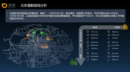 在通勤数据方面,工作日7点-9点是北京的通勤高峰时段,从天通苑、回龙观前往望京、国贸等工作地点,平均车速只有每小时20公里左右,不可谓不堵。但是更让人“心塞”的是,从回龙观到西二旗软件园上班的“码农们”,工作日早高峰,平均车速甚至低于每小时15公里,短短9公里路程平均耗时大多在40分钟以上。