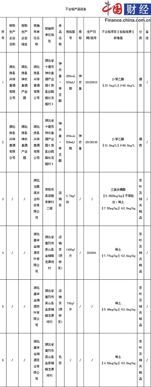 中国网财经9月30日讯 29日,湖北省食品药品监督管理局官网发布食品安全监督抽检信息公告(2016年第38期),本次监督抽检的食品包括茶叶及相关制品、调味品、方便食品、其他食品、肉制品、乳制品、食品添加剂、食糖、蔬菜制品、薯类和膨化食品、水产制品、速冻食品、糖果制品、饮料14类食品353批次,抽样检验项目合格样品347批次,不合格样品6批次。其中酒类不合格2批次,茶叶及相关制品不合格4批次。