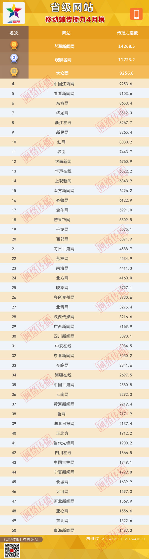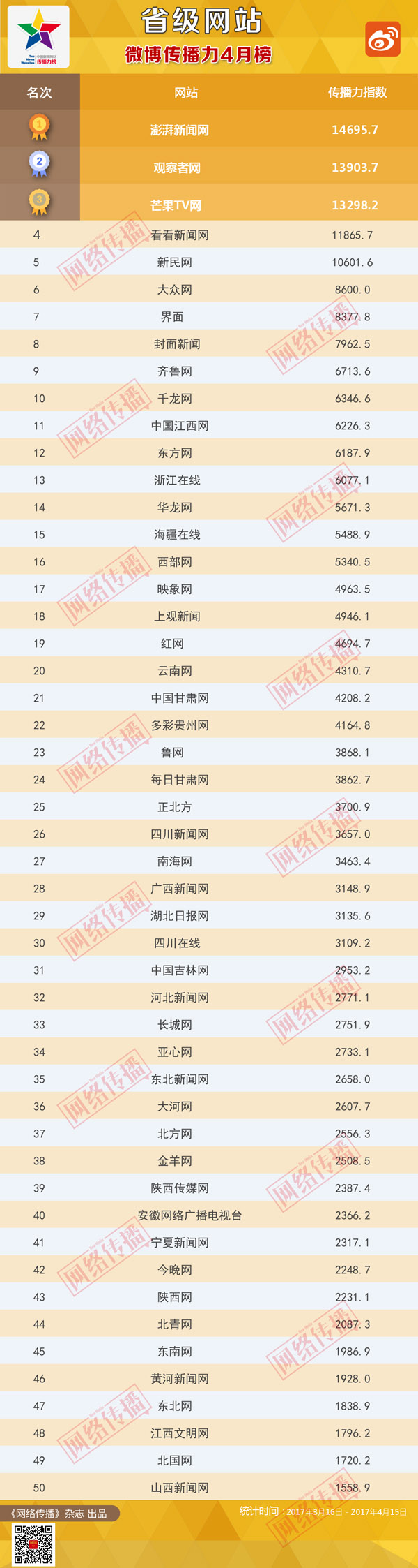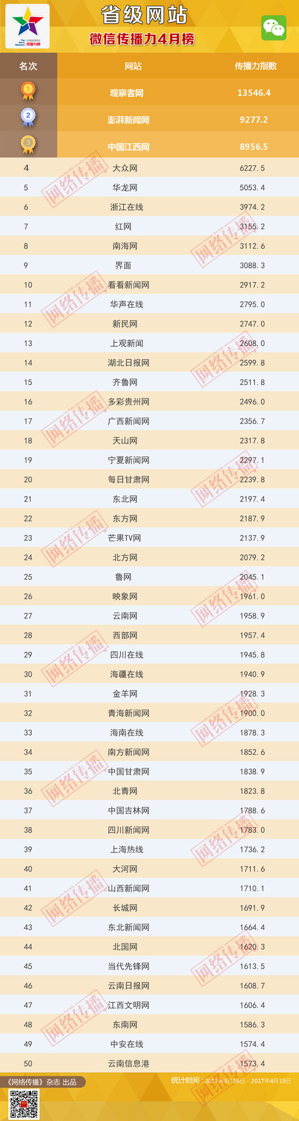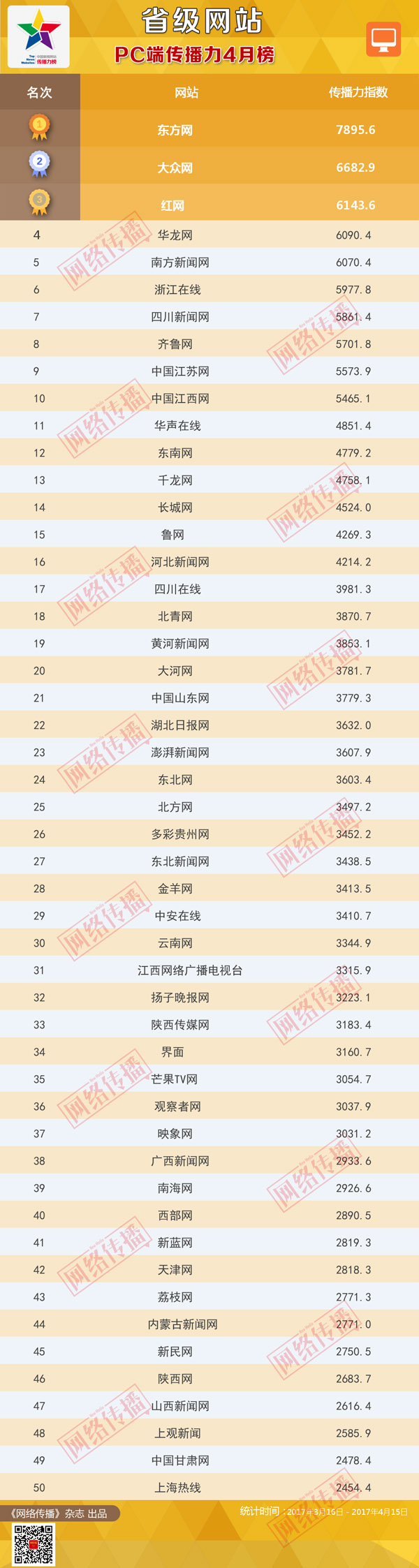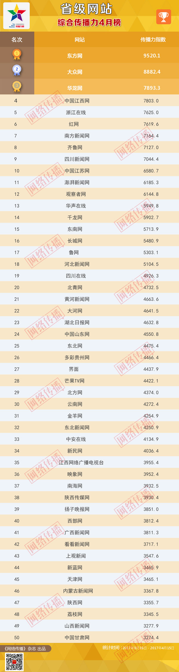 中央网信办《网络传播》杂志倾力打造的“省级网站传播力2017年4月榜”今日发布。