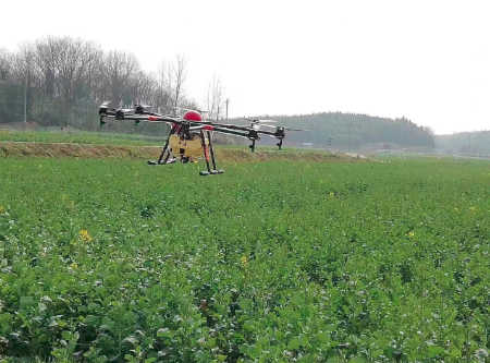 目前,咸宁市咸安区农业局植保站已经出动了6个专业化飞防队伍,15台无人机,对当地的油菜田进行植保飞防工作。植保站站长曹升记说,“1台无人机每天的飞防面积要确保在350亩到400亩之间,确保油菜菌核病的防治工作做到位。”