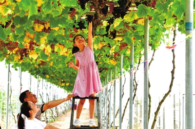 10月2日,嘉鱼县新街镇世外葡萄园,一名小女孩正在体验采摘乐趣。