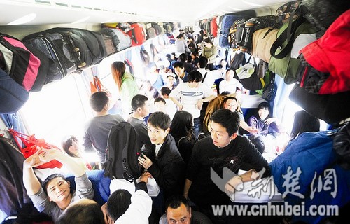 楚天都市报三路记者日前登上武汉到成都、贵阳、重庆的三趟列车,探访发现,火车上站着的旅客九成是农民工,有的农民工甚至站了十几个小时。