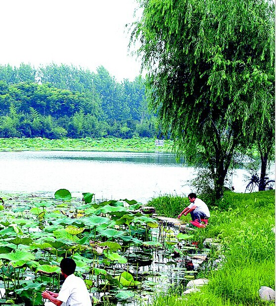 湖边不乏垂钓者。湖上,一些不知名的浮游小鱼正嬉戏荷叶间。