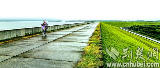 前几日还是暑热难耐,8月12日,突然气温骤降,风雨交加,悄然间,已经嗅到了秋日的气息。傍晚时分,雨刚停不久,记者一行人漫步在坝顶,清冽的风迎面而来,让人精神为之一振。极目远眺,大坝呈“S”形,似一条巨龙横亘在洈水之上。放眼浩瀚湖面,烟波流转,绿岛耸峙;俯瞰脚下坝坡,郁郁柔草,如茵如毯。远山泼墨作底,近岸碧水入画,低天密云堆叠,田园绿树细描,三两村居点染,洈水水库就是这样一幅气韵悠然的山水图。