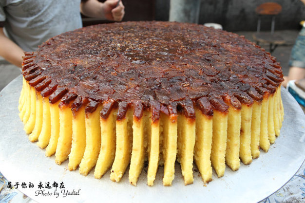 桂花糕,在西羊市的一个小角落,看上去并不起眼,但据当地朋友介绍,这个老板买这个桂花糕已经很多年了。而且老板将桂花糕做成一个厚厚的大圆饼状,顾客买的时候,就用一把特制的刀切,于是整个桂花糕一周就成了齿轮状,看上去还挺好看的。