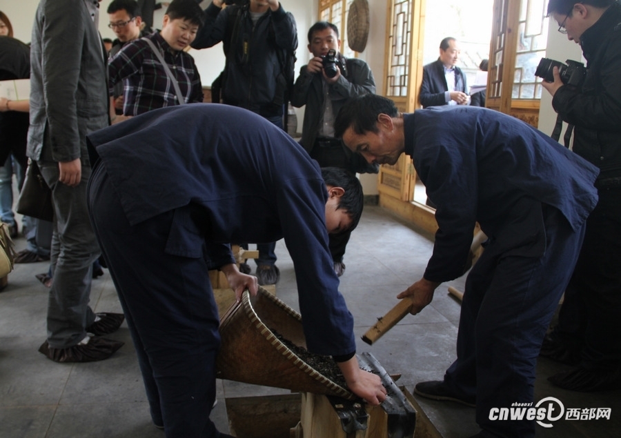 作坊里的师傅正在进行茶叶压制工作。