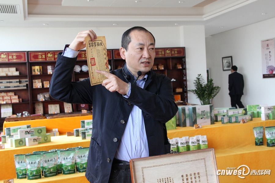 咸阳泾渭茯茶有限公司董事长纪晓明向编辑记者介绍泾渭茯茶。