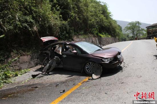 记者在赶赴雅安的路上,一辆轿车遇险遭损坏。中新社记者 史元丰 摄