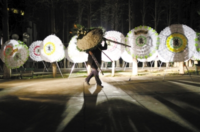 今日8点08分,江苏华西村原党委书记吴仁宝追悼会举行。昨晚,工作人员正在搬运悼念用的花圈到民族宫门口。新京报记者浦峰摄