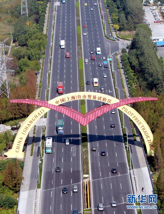 这是在警航巡逻直升机上拍摄的通往上海自贸区的大道(2013年10月29日摄)。 “法无禁止皆可为、法无授权不可为、法定职责必须为”——上海外高桥综合服务大厅竖立的这块显眼招牌,因中国(上海)自由贸易试验区一年来的探索实践广为人知。 2014年9月29日,上海自贸区挂牌成立已满一年。虽然看不到“推地刨坑、大楼拔地”的大规模变化,但“润物无声”的法治建设与制度变革一直激荡其中。新华社记者 凡军 摄