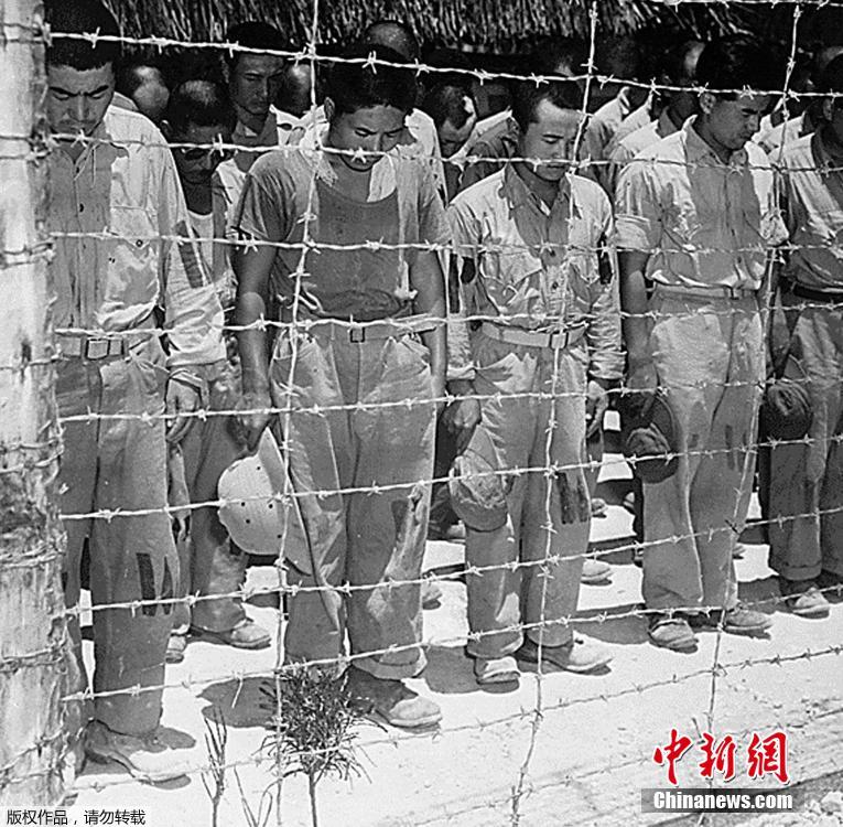 1945年8月15日在关岛的日本战俘,听到裕仁天皇让日本无条件投降的声明,结束了第二次世界大战后低头鞠躬。