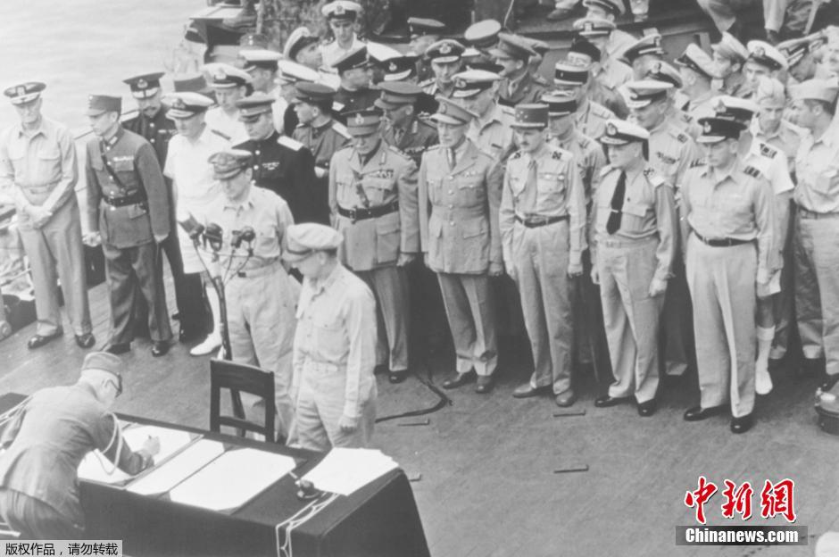1945年9月2日,日本新任外相重光葵代表日本天皇和政府、陆军参谋长梅津美治郎代表帝国大本营在投降书上签字。