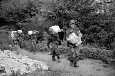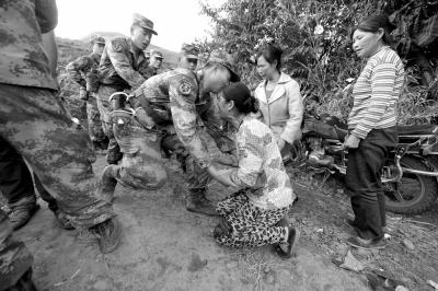 昨天下午,历经近2个小时,翻越2座高山后,战士们将背负的物资送到磨嘈湾村村民手中,受灾群众欲下跪感谢,被战士急忙拦住。本版图片京华时报记者陶冉摄