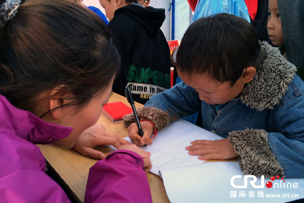 图为孩子在领取助学金时一笔一划认真写下自己的名字。肖中仁 摄