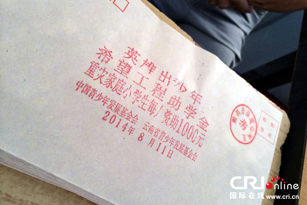 中国青少年发展基金会发放的装有1000元助学金信封。肖中仁 摄
