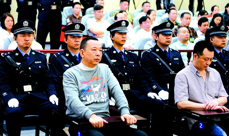 湖北日报讯 图为:23日,被告人刘汉(前左)、唐先兵(前右)均被咸宁中院一审宣判死刑。后者是杀害熊伟的直接凶手。 (本报报道组 摄)