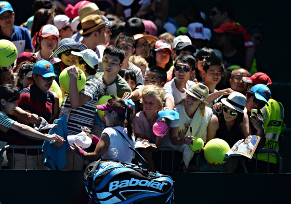 2014年1月21日,澳网女单比赛,李娜赛后为球迷签名。