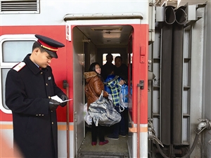 在金报记者和铁路工作人员的帮助下,刘鉴良一家终于踏上回家的列车 记者 薛曹盛 摄
