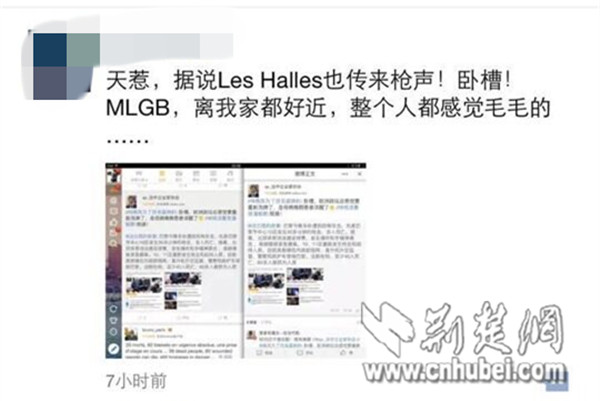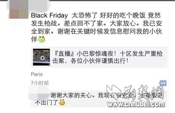 荆楚网消息(记者冯梓晔)“只是出门吃个饭,没想到最后差点回不了家。”11月14日,荆楚网记者用微信联系到在巴黎学服装设计的湖北女孩“豆糖”,她说,当地时间晚上10点左右,她和男友在巴黎九区一家餐馆吃饭。男友在刷手机时突然叫道,StadedeFrance、Concourt、République被袭击了!随后他们了解到11区的剧院和BoulevardVoltaire都被劫持。