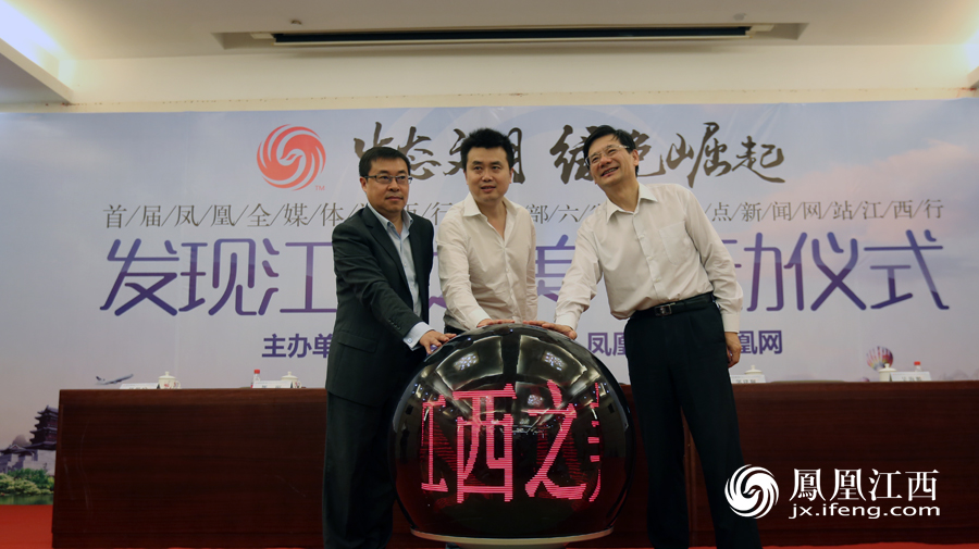 江西省委常委、省委宣传部部长姚亚平,凤凰网首席执行官(CEO)、凤凰卫视首席运营官(COO)刘爽,凤凰网总编辑兼副总裁邹明共同启动江西行活动。(史玉琨摄)