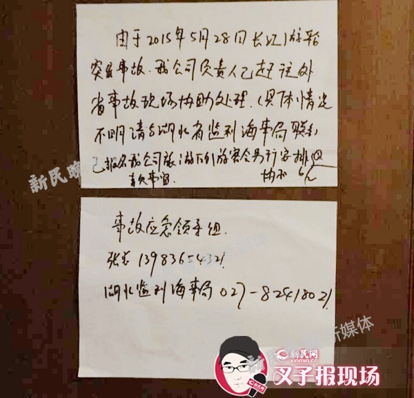 【新民网·独家报道】6月2日上午9时许,新民晚报新民网记者赶到位于天目西路547号29楼的上海协和旅游公司,该公司办公室内空无一人,门口张贴着一张手写的告示,称相关负责人已经赶往湖北沉船事故现场协调处理后续事宜。(新民晚报新民网 萧君玮)