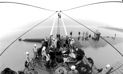 6月2日,救援人员在沉船现场对“东方之星”轮展开营救。新华社记者 肖艺九摄