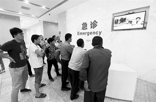 图为:昨日,监利县人民医院的急诊大厅内市民围在电视机前观看救援直播。(记者 张朋 摄)