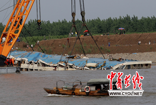 6月5日,湖北监利附近的长江江面,一艘小船从正在“浮”出水面的“东方之星”号出事客轮旁通过。当日,这艘出事客轮整体扶正后,又在起重船的牵引下缓缓“浮”起,为最后的打捞和清理工作做准备。