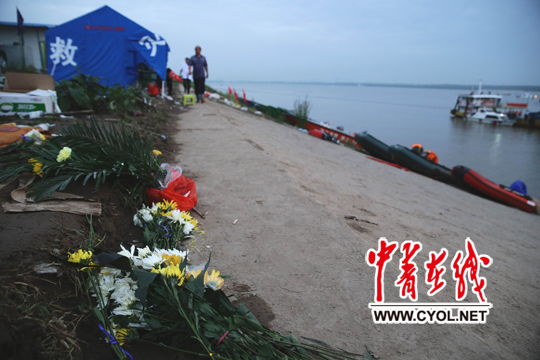 6月5日, 湖北监利“东方之星”号出事客轮附近水域岸边,摆放着家属悼念亲人的鲜花。