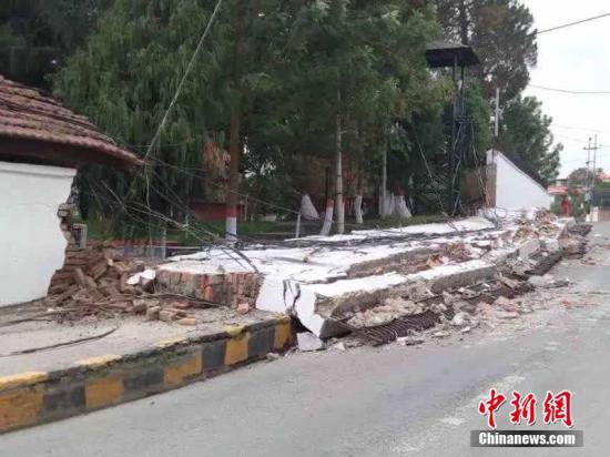 据中国地震台网正式测定:04月25日14时11分在尼泊尔(北纬28.2度,东经84.7度)发生8.1级地震,震源深度20千米。图为中新社记者前往尼总理府途中看到一片混乱,总理府一段围墙倒塌。中新社记者 符永康 摄
