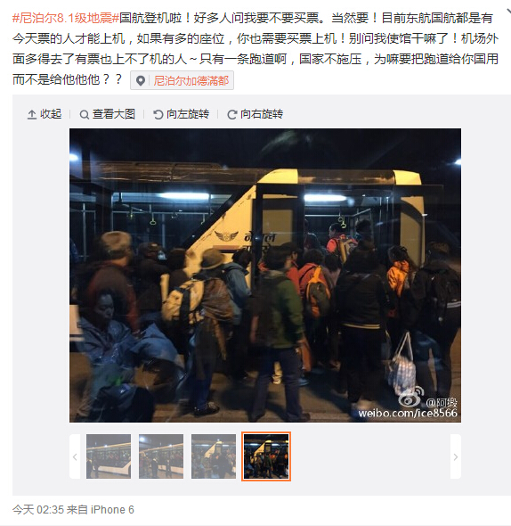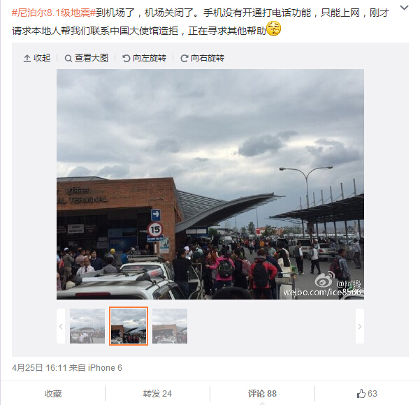网友“过后无垠”热心提醒:“尼泊尔机场短时间不可能开放了,他们的基础设施本来就不是太好。如果有其他交通运输工具,也不要放弃。保存食物和饮水,估计补给至少要明天下午。”