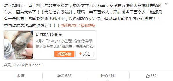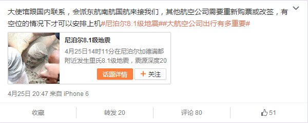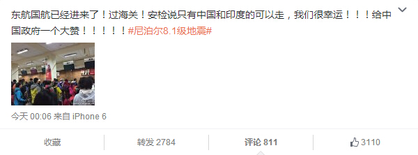 网友“玉宝-yuki”:“被这个姑娘的安危牵扯了一天。无论身在何处,听到本国航空那句,我接你们回家。都会是最好的慰籍吧!在尼泊尔,当地的人们在面对中国游客时,都会说因为你是中国人,我们是朋友!这样细微平常却温暖的话…给中国政府一点信任,给祖国一个赞。因为,在灾难面前,只有他们才是你最大的靠山。”