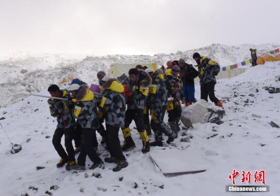 当地时间4月25日,尼泊尔强震引发珠穆朗玛峰雪崩,部分基地大本营被埋。救援队紧急救援。