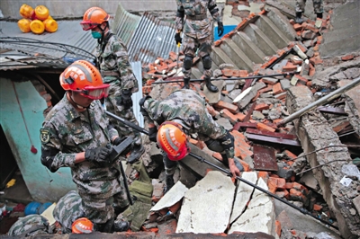 昨日,加德满都,一处因地震坍塌的楼房里,中国人民解放军十四集团军某工兵团地震救援队30多名救援队员,带着生命探测仪等设备实施救援。新京报首席记者 陈杰 摄